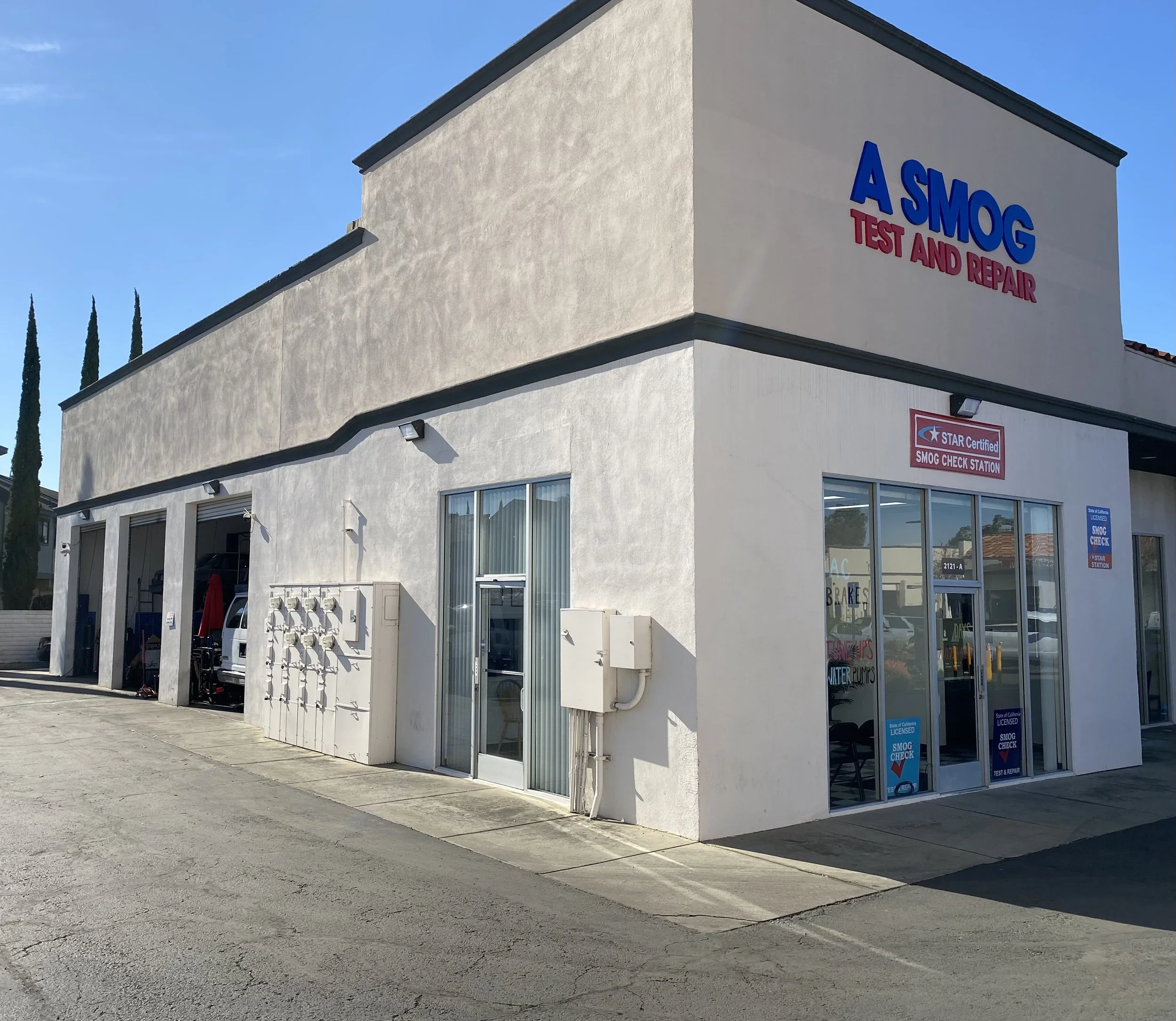 Logo with large blue text reading 'A SMOG' and smaller red text below stating 'TEST AND REPAIR'.